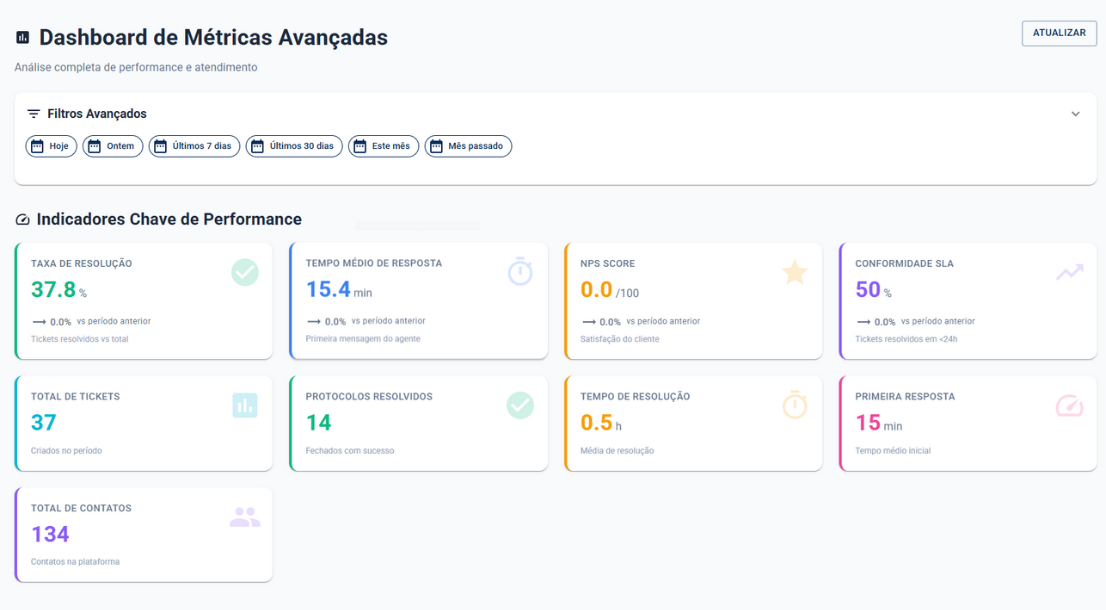 Veja tudo acontecendo em tempo real: desempenho, tempo de resposta, volume de atendimentos e muito mais.